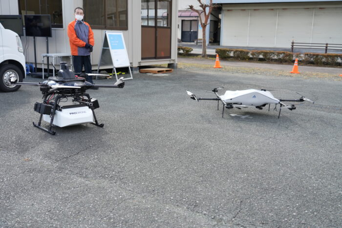 本実証で使用する物流専用ドローンPD4BM-AN(手前)、AirTruck(奥)愛知県(知事:大村 秀章)と、新城市(市長:下江 洋行)、株式会社NEXT DELIVERY(本社:山梨県小菅村、代表取締役:田路 圭輔、以下NEXT DELIVERY)、株式会社グリーンサービス(本社:名古屋市北区、代表取締役社長:松井 清吾、以下 グリーンサービス)、株式会社Prodrone(本社:名古屋市天白区、代表取締役社長:戸谷 俊介、以下 Prodrone)、セイノーホールディングス株式会社(本社:岐阜県大垣市、代表取締役社長:田口 義隆、以下 セイノーHD)、愛知東農業協同組合(本社:愛知県新城市、代表理事組合長:海野 文貴、以下 JA愛知東)は、愛知県新城市にて、物流ドローンを活用した「新スマート物流」*1の長期事業化に向けた調査を行う実証実験を開始し、2025年11月28日(金)に、その様子を報道関係者に公開しました。
