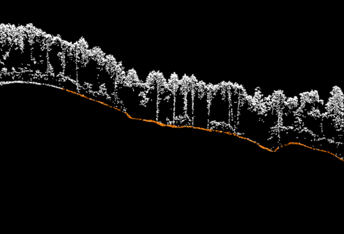 飛行高度125m 飛行スピード8m/s時の点群データ(提供:株式会社ビジュアル・システムズ)取得した点群データから、エリア内の人間が立った位置のデータを手作業で不要データを削除し動物の特定が可能です。木々などの不要物をうまく取り除き、生育エリアを特定します。